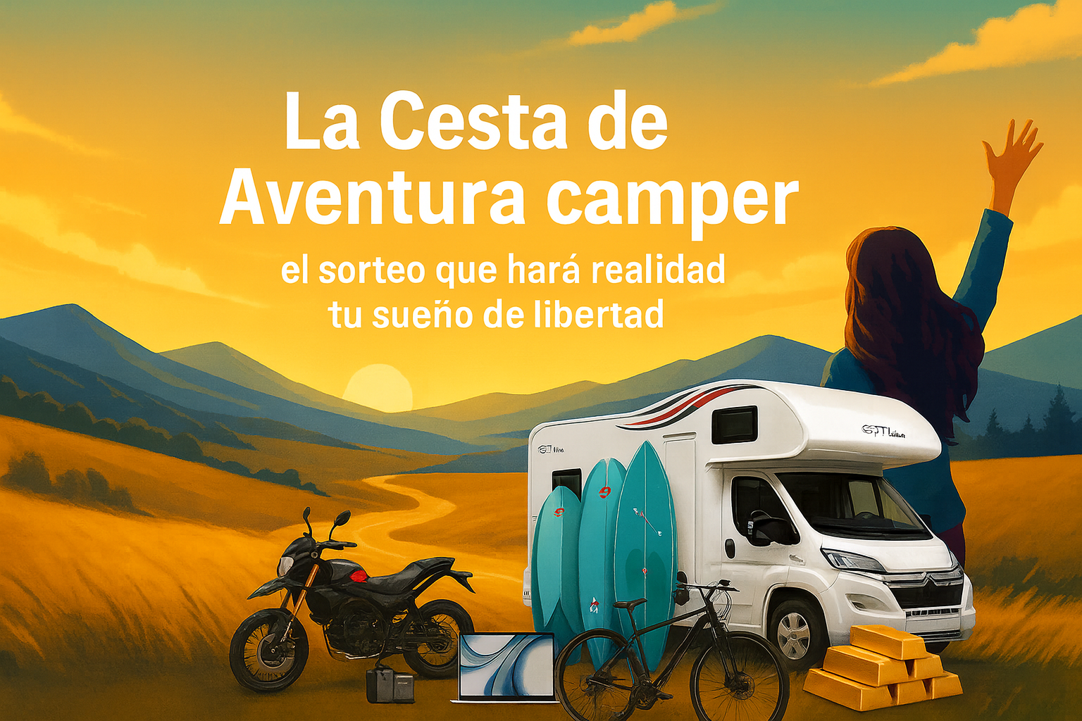Aquí es donde entra en juego La Cesta de Aventura camper. Un sorteo diseñado para ofrecer mucho más que dinero: un estilo de vida completo. No hablamos de premios aislados, sino de un pack que elimina todas las excusas y barreras para empezar a vivir con libertad. Desde la autocaravana Siena equipada hasta los más de 45.000 € en oro para cubrir impuestos, pasando por gasolina, seguro, viajes, motos, bicis, equipos deportivos y hasta tecnología Apple de última generación.